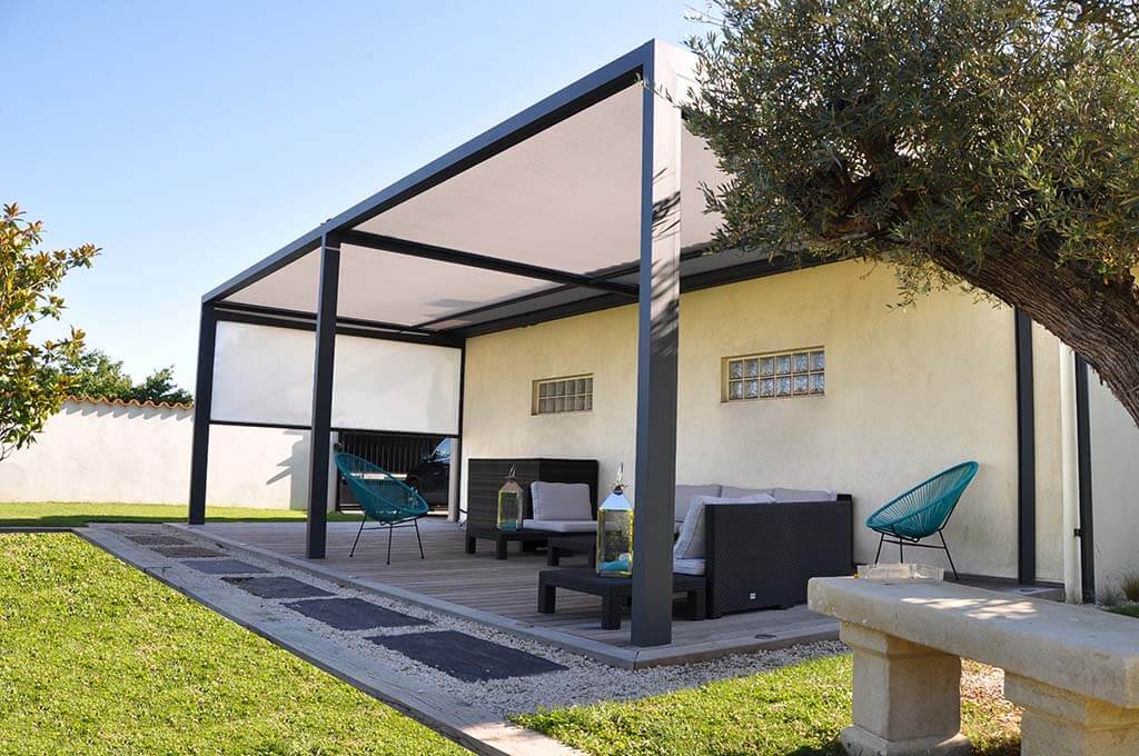 Pergola à toile rétractable, la COCOON+ permet de s’abriter de la chaleur de manière optimale ou de faire entrer toute la lumière disponible dans la maison en fonction du besoin. Sa toile zippée permet une excellente tenue au vent et un écoulement de l’eau lors de la présence de pluie. Profitez ainsi de votre terrasse dès l’averse passée!
