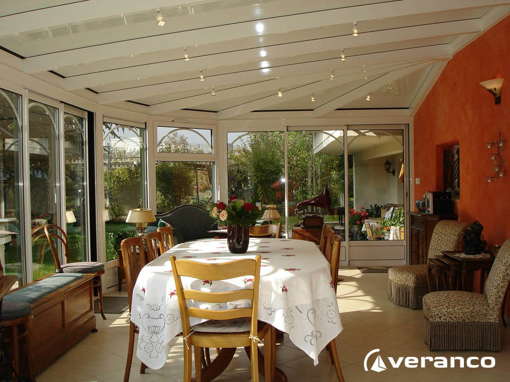 - La toiture de la véranda est constituée d’une faîtière solidement ancrée au bâti, d’un chéneau reposant sur de vrais poteaux, et de chevrons tubulaires idéals pour la robustesse et le positionnement des spots intégrés. Nos toitures sont à rupture intégrale de pont thermique. Votre toiture pourra se fermer de différentes manières en fonction de vos souhaits (vitrage, panneaux isolants opaques, ou polycarbonate).