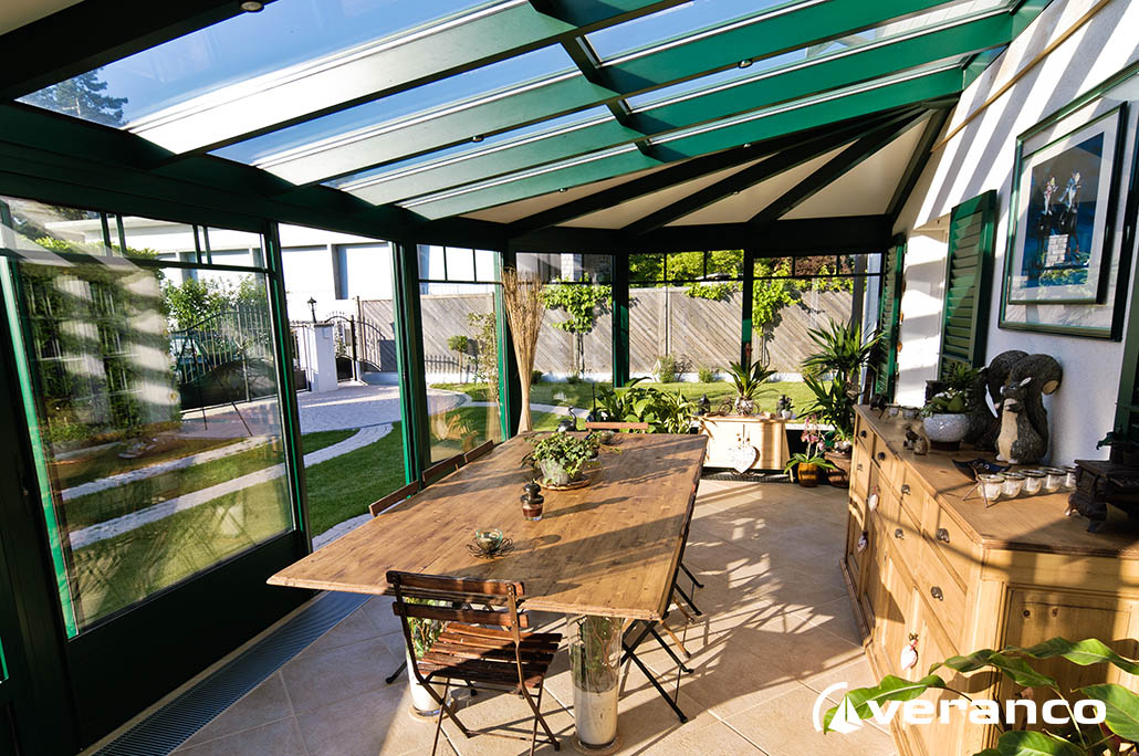- Les menuiseries de la véranda sont constituées de coulissants à 2, 3 ou 4 vantaux en fonction des dimensions choisies. Les 4 pans coupés sont fixes et accueillent idéalement les ventilations hautes et basses.